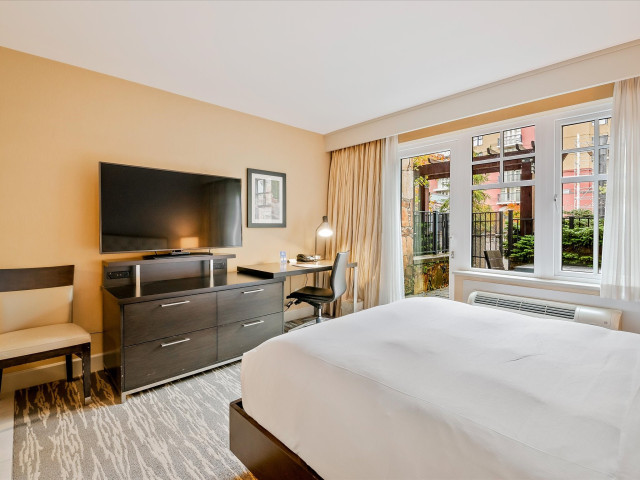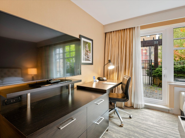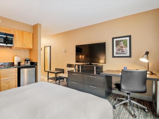 A nice studio suite in Hilton Hotel at the heart of Whistler. Located on the ground level, it has a spacious patio facing the upgraded Hilton courtyard. The unit is configured with a queen sized bed and living space. The kitchen has a fridge, dishwasher, stove top and microwave. You share the same hotel supplies as the big units: a heated outdoor pool, hot tub, spa, gym, après lounge, restaurant, coffee corner, underground parking and complementary ski concierge. Hilton is the only Phase I hotel in Whistler and allows owners' unlimited use. Rental has to be through Hilton Hotel.