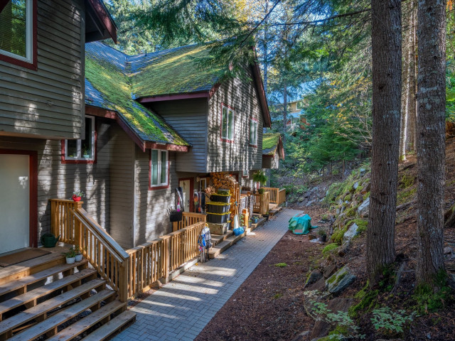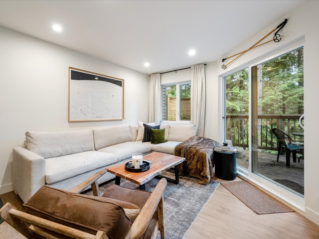Stunningly renovated 4-bedroom, 2-bathroom Bayshores townhome. The open-concept main floor features a gourmet kitchen with quartz counters and a large island, flowing into a bright living room with a cozy wood-burning fireplace, private forest-view deck and hot tub. The updated bathrooms boast spa-like finishes with heated floors. A rec room and wetbar area downstairs provided maximum flexibility to watch the game, for kids to play or to close off and host friends or family with own entrance. A large mudroom with custom cabinets organizes all your gear year round. Located steps from the Valley Trail, minutes to the Creekside Gondola and Alpha Lake Park. This is a perfect turnkey Whistler sanctuary.