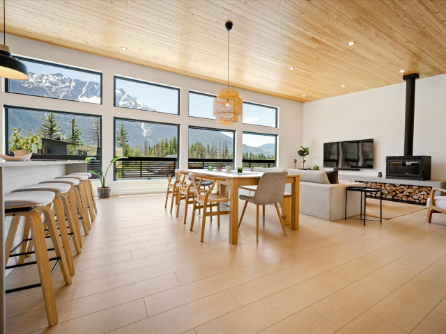 An exceptional custom-built Sunstone home with incredible mountain views and quality finishings throughout. Built to Step Code 4 with triple-glazed windows, HRV, and A/C in both the main home and suite. Enjoy 12’ ceilings, a 12’ kitchen island, quartz waterfall countertops, hemlock wood ceilings, wood stove, and spacious open-concept living. Features include a dedicated home office with private bath, large laundry room, generous storage, and oversized heated garage with sink. Outside offers a covered patio, EV charger rough-in, RV pad, and direct valley trail access— on a private cul-de-sac with no rear or side neighbours.