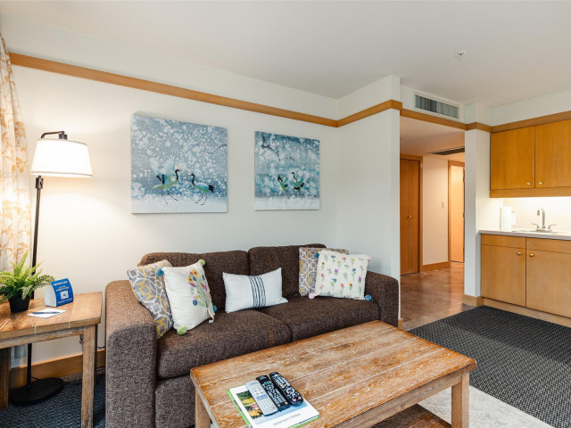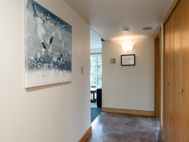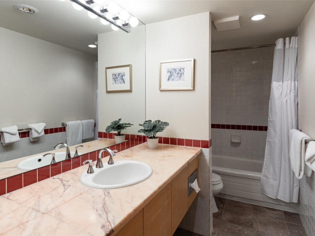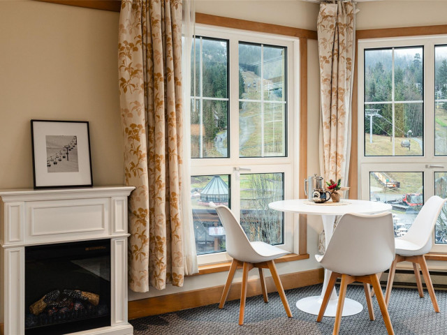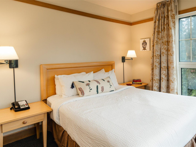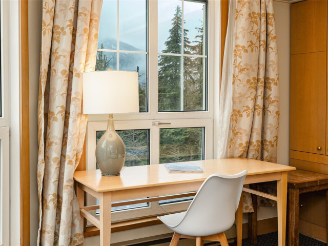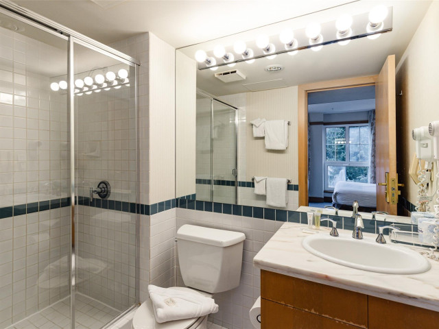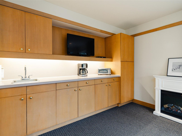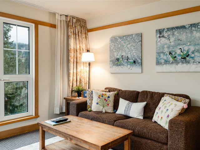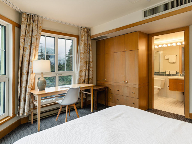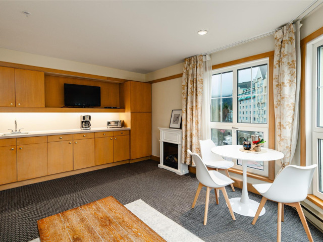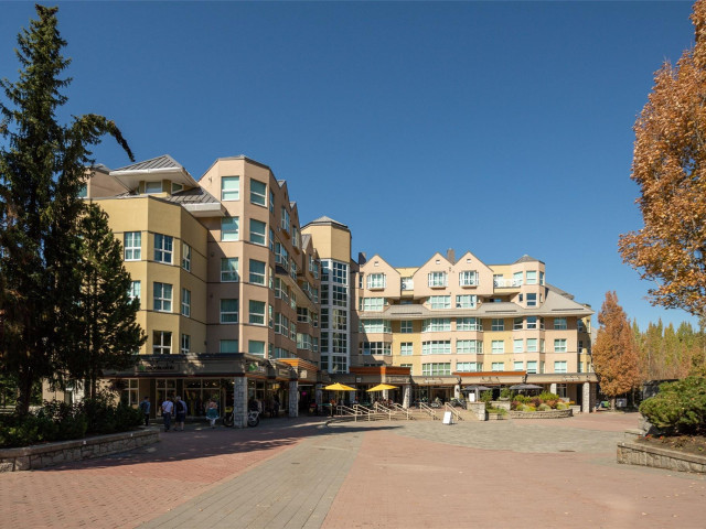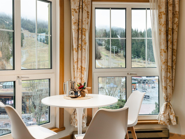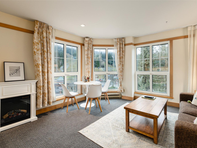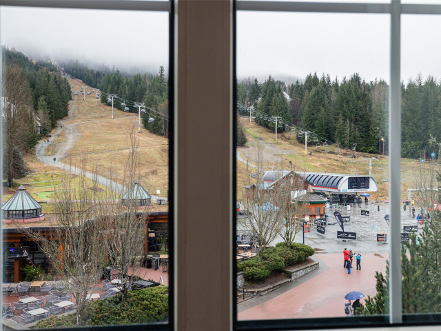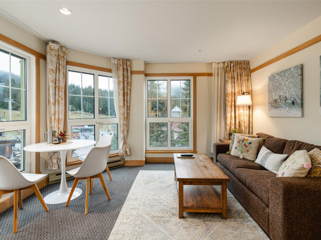 This is Le Chamois, the concrete building right at foot of Blackcomb Mountain. Unit 404 is at the highest level of the building that has small units. This unique corner unit gives you view of both Blackcomb Mountain and Whistler Mountain. Sitting by your living room windows, you can see everything happening on the Upper Village stroll, from the Blackcomb Gondola wait line, to Whistler Ski school gathering. The 2 bathrooms design makes the living room an independent sleeping area like a second bedroom, which is highly sought after on short-term rental market with potential for a higher return.