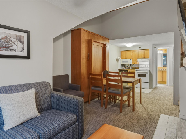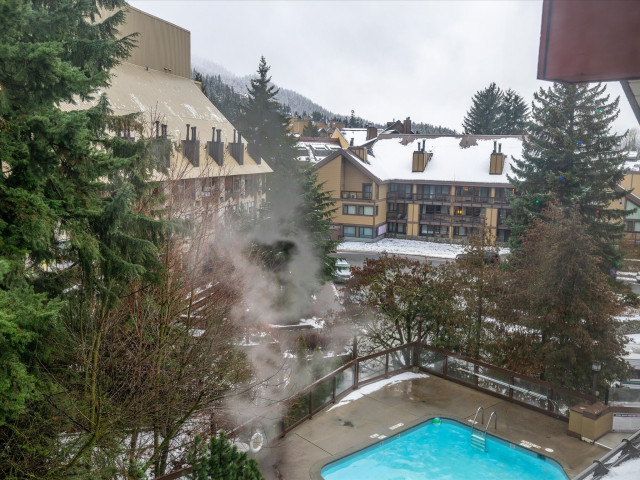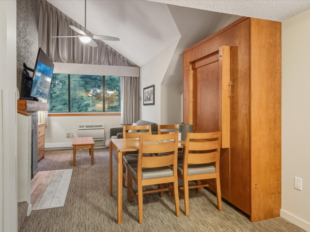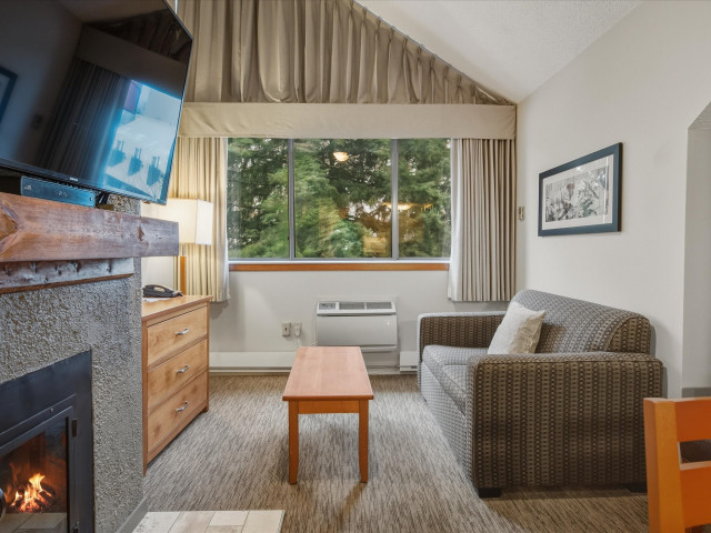 Perfectly positioned in the heart of Whistler Village, this bright and lofted studio suite offers an unbeatable Whistler Village lifestyle with postcard views and everything at your doorstep. Just a short stroll to the base of both Whistler and Blackcomb Mountains, this is a true four-season retreat in the heart of the action. Vaulted ceilings and large windows fill the space with natural light, while a cozy fireplace, fully equipped kitchenette, and balcony overlooking the pool and hot tub create a welcoming mountain retreat. With a queen bed in the loft and a convenient Murphy bed in the living area, the space is both functional and welcoming. A Phase 2 property, owners enjoy up to 56 days of personal use per year with hotel-managed, hands-off rentals the rest of the time. Resort-style amenities include a year-round outdoor pool, indoor and outdoor hot tubs, sauna, fitness room, ski storage, secure underground parking, and front desk service. With restaurants, shops, pubs, and adventure steps from your doorstep, this is an exceptional opportunity to own a piece of Whistler.